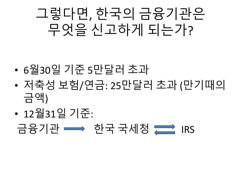 그렇다면, 한국의 금융기관은 무엇을 신고하게 되는가? • 6월30일 기준 5만달러 초과 • 저축성 보험/연금: 25만달러 초과 (만기때의 금액) • 12월31일 기준: 금융기관 한국 국세청 IRS