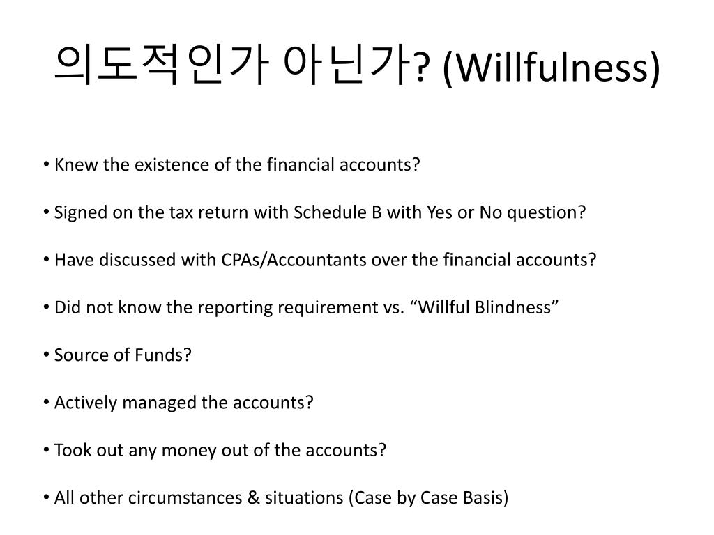의도적인가 아닌가? (Willfulness) • Knew the existence of the financial accounts? • Signed on the tax return with Schedule B with Yes or No question? • Have discussed with CPAs/Accountants over the financial accounts? • Did not know the reporting requirement vs. “Willful Blindness” • Source of Funds? • Actively managed the accounts? • Took out any money out of the accounts? • All other circumstances & situations (Case by Case Basis)
