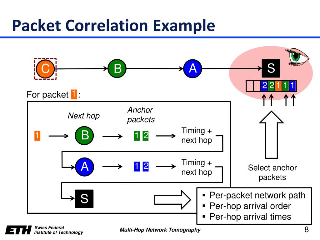 Packet Correlation Example S B C A 1 1 2 2 1 For packet : 1 Anchor packets Next hop Timing + next hop B 1 1 2 A Timing + next hop Select anchor packets 2 1 S • Per-packet network path • Per-hop arrival order • Per-hop arrival times