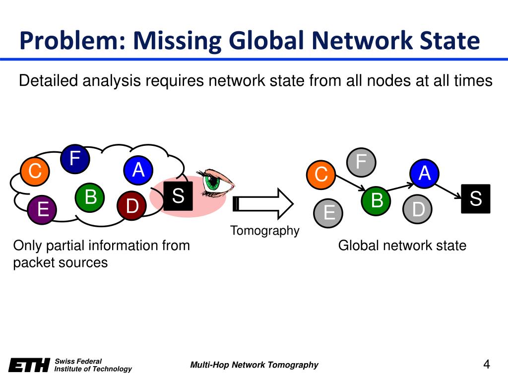 Problem: Missing Global Network State Detailed analysis requires network state from all nodes at all times F F A C A C S B S B D E D E Tomography Only partial information frompacket sources Global network state