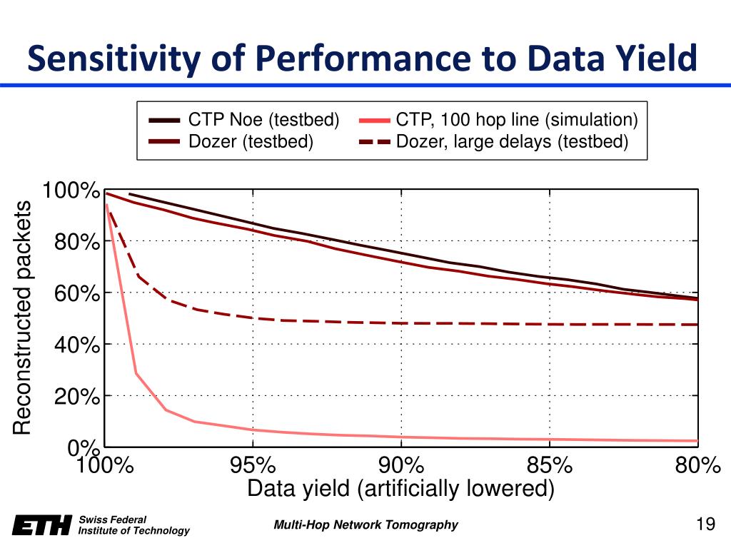 Sensitivity of Performance to Data Yield CTP Noe (testbed) Dozer (testbed) CTP, 100 hop line (simulation) Dozer, large delays (testbed)