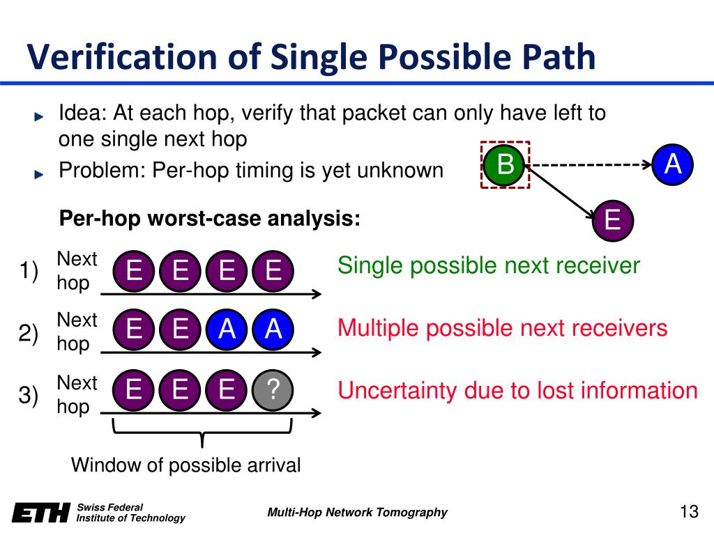 Verification of Single Possible Path • Idea: At each hop, verify that packet can only have left to one single next hop • Problem: Per-hop timing is yet unknown A B E Per-hop worst-case analysis: Next hop Single possible next receiver E E E E 1) Next hop E E A A Multiple possible next receivers 2) Next hop E E E ? Uncertainty due to lost information 3) Window of possible arrival