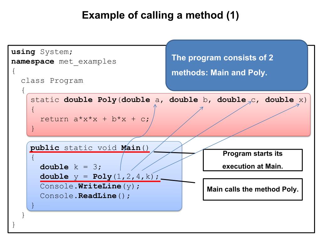 Example of calling a method (1) The program consists of 2 methods: Main and Poly. using System;namespacemet_examples{ class Program { static doublePoly(double a, double b, double c,double x) { return a*x*x + b*x + c; }public static void Main() { double k = 3; double y = Poly(1,2,4,k);Console.WriteLine(y);Console.ReadLine(); } }} Main calls the method Poly. Program starts its execution at Main.