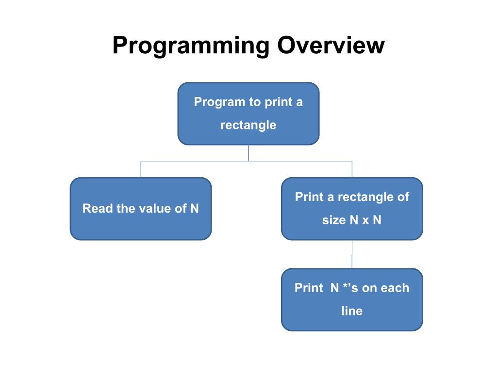 Programming Overview Program to print a rectangle Read the value of N Print a rectangle of size N x N Print N *’s on each line