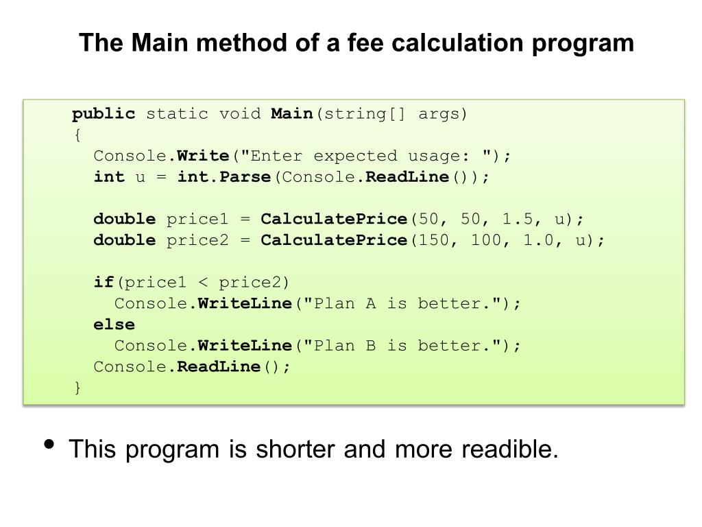 The Main method of a fee calculation program public static void Main(string[] args) {Console.Write("Enter expected usage: ");int u = int.Parse(Console.ReadLine());double price1 = CalculatePrice(50, 50, 1.5, u);double price2 = CalculatePrice(150, 100, 1.0, u);if(price1 < price2)Console.WriteLine("Plan A is better.");elseConsole.WriteLine("Plan B is better.");Console.ReadLine(); } • This program is shorter and more readible.