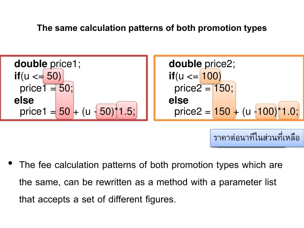 The same calculation patterns of both promotion types • The fee calculation patterns of both promotion types which are the same, can be rewritten as a method with a parameter list that accepts a set of different figures. double price1;if(u <= 50) price1 = 50;else price1 = 50 + (u - 50)*1.5; double price2;if(u <= 100) price2 = 150;else price2 = 150 + (u -100)*1.0; ราคาต่อนาทีในส่วนที่เหลือ จำนวนนาทีที่โทรฟรี ค่าใช้จ่ายรายเดือน