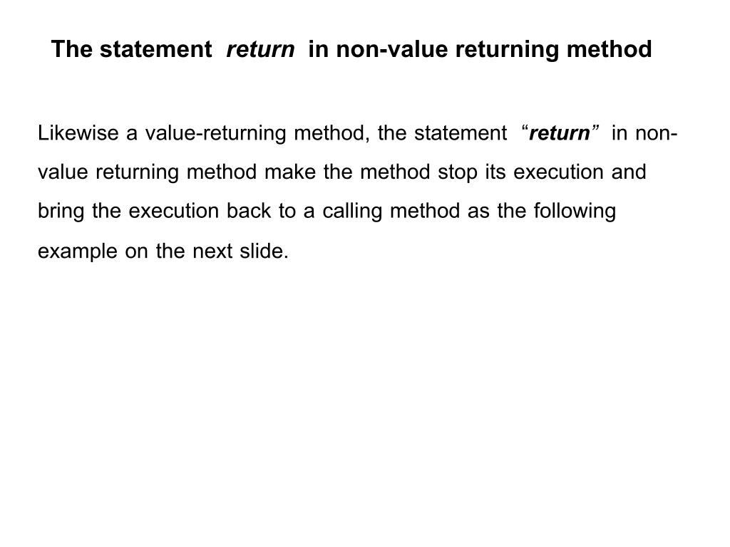 The statement return in non-value returning method Likewise a value-returning method, the statement “return” in non-value returning method make the method stop its execution and bring the execution back to a calling method as the following example on the next slide.