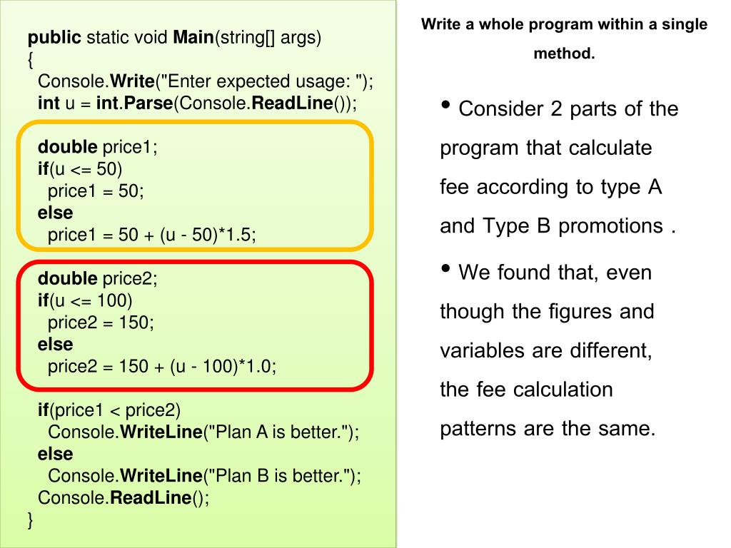 public static void Main(string[] args) {Console.Write("Enter expected usage: ");int u = int.Parse(Console.ReadLine());double price1;if(u <= 50) price1 = 50;else price1 = 50 + (u - 50)*1.5;double price2;if(u <= 100) price2 = 150;else price2 = 150 + (u - 100)*1.0;if(price1 < price2)Console.WriteLine("Plan A is better.");elseConsole.WriteLine("Plan B is better.");Console.ReadLine(); } Write a whole program within a single method. • Consider 2 parts of the program that calculate fee according to type A and Type B promotions . • We found that, even though the figures and variables are different, the fee calculation patterns are the same.