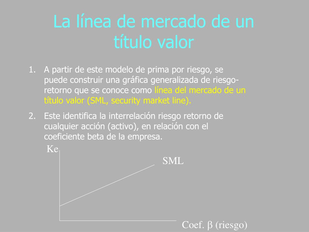 La línea de mercado de un título valor • A partir de este modelo de prima por riesgo, se puede construir una gráfica generalizada de riesgo-retorno que se conoce como línea del mercado de un título valor (SML, security market line). • Este identifica la interrelación riesgo retorno de cualquier acción (activo), en relación con el coeficiente beta de la empresa. Ke SML Coef. (riesgo)