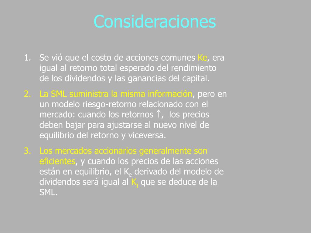 Consideraciones • Se vió que el costo de acciones comunes Ke, era igual al retorno total esperado del rendimiento de los dividendos y las ganancias del capital. • La SML suministra la misma información, pero en un modelo riesgo-retorno relacionado con el mercado: cuando los retornos , los precios deben bajar para ajustarse al nuevo nivel de equilibrio del retorno y viceversa. • Los mercados accionarios generalmente son eficientes, y cuando los precios de las acciones están en equilibrio, el Ke derivado del modelo de dividendos será igual al Kjque se deduce de la SML.