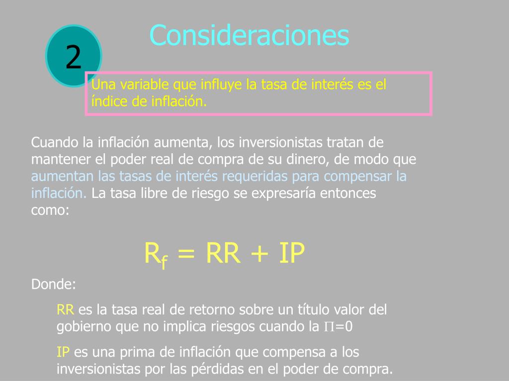Consideraciones 2 Una variable que influye la tasa de interés es el índice de inflación. Cuando la inflación aumenta, los inversionistas tratan de mantener el poder real de compra de su dinero, de modo que aumentan las tasas de interés requeridas para compensar la inflación. La tasa libre de riesgo se expresaría entonces como: Rf = RR + IP Donde: RR es la tasa real de retorno sobre un título valor del gobierno que no implica riesgos cuando la =0 IP es una prima de inflación que compensa a los inversionistas por las pérdidas en el poder de compra.