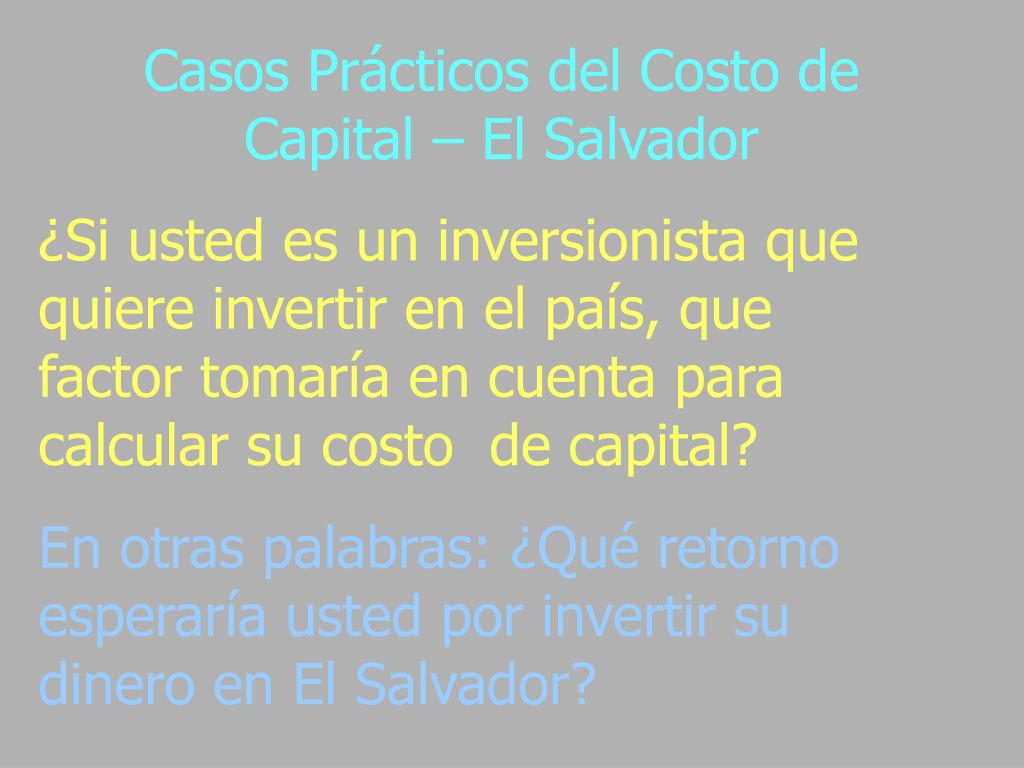 Casos Prácticos del Costo de Capital – El Salvador ¿Si usted es un inversionista que quiere invertir en el país, que factor tomaría en cuenta para calcular su costo de capital? En otras palabras: ¿Qué retorno esperaría usted por invertir su dinero en El Salvador?
