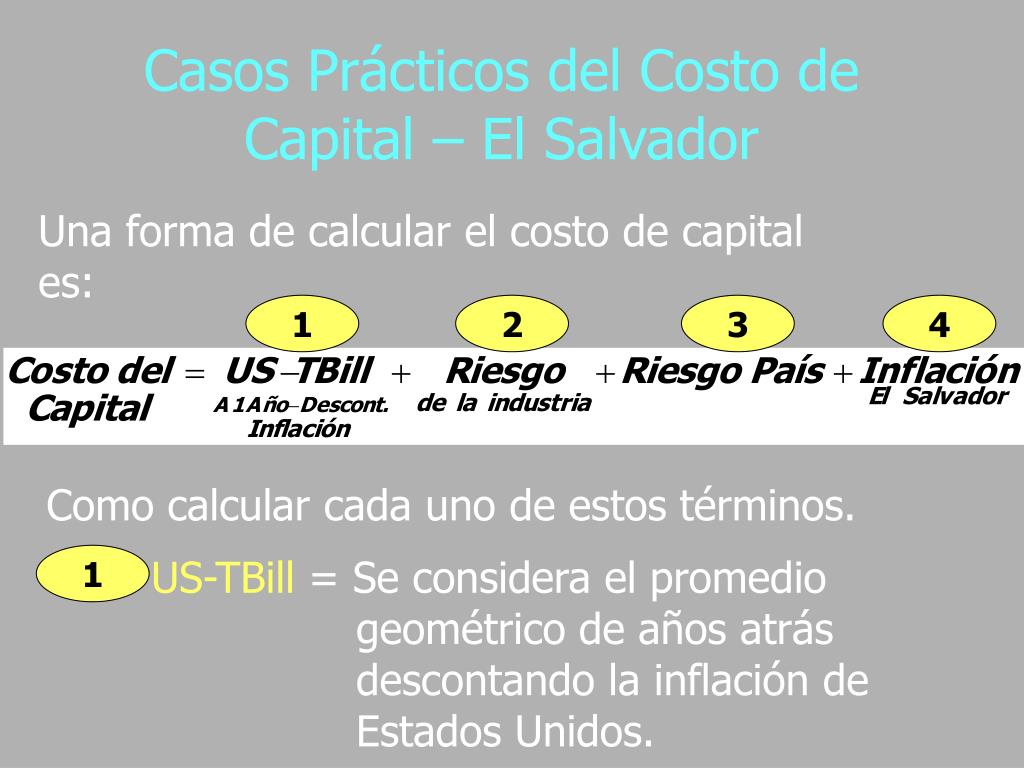 Casos Prácticos del Costo de Capital – El Salvador Una forma de calcular el costo de capital es: 1 2 3 4 Como calcular cada uno de estos términos. 1 US-TBill = Se considera el promedio geométrico de años atrás descontando la inflación de Estados Unidos.