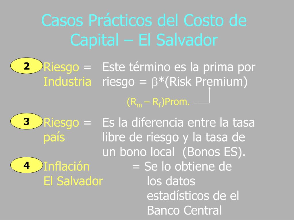 Casos Prácticos del Costo de Capital – El Salvador 2 Riesgo = Este término es la prima por Industria riesgo = *(Risk Premium) (Rm – Rf)Prom. 3 Riesgo = Es la diferencia entre la tasa país libre de riesgo y la tasa de un bono local (Bonos ES). 4 Inflación = Se lo obtiene de El Salvador los datos estadísticos de el Banco Central