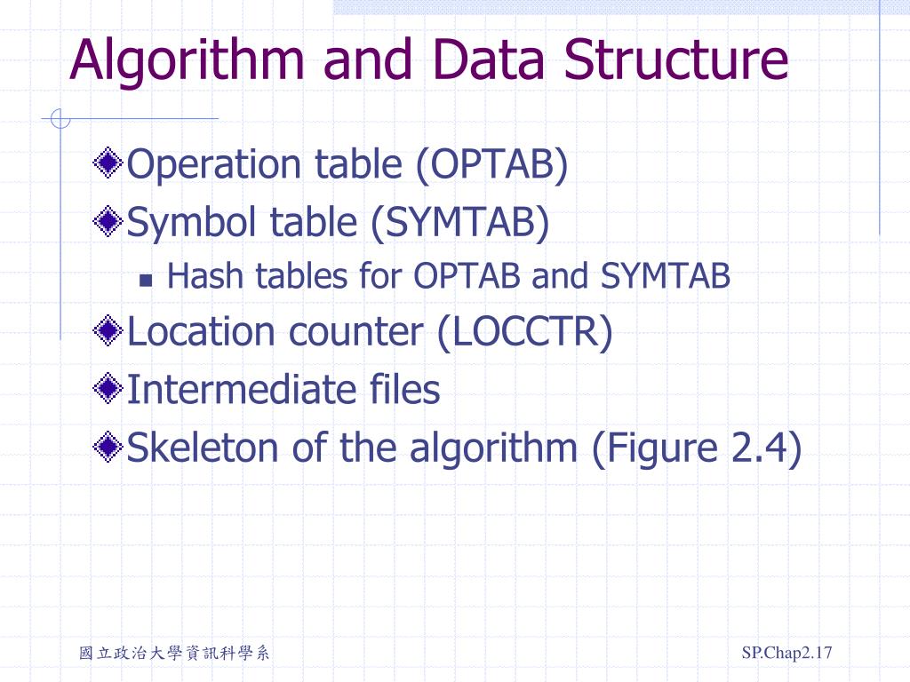 Algorithm and Data Structure • Operation table (OPTAB) • Symbol table (SYMTAB) • Hash tables for OPTAB and SYMTAB • Location counter (LOCCTR) • Intermediate files • Skeleton of the algorithm (Figure 2.4)