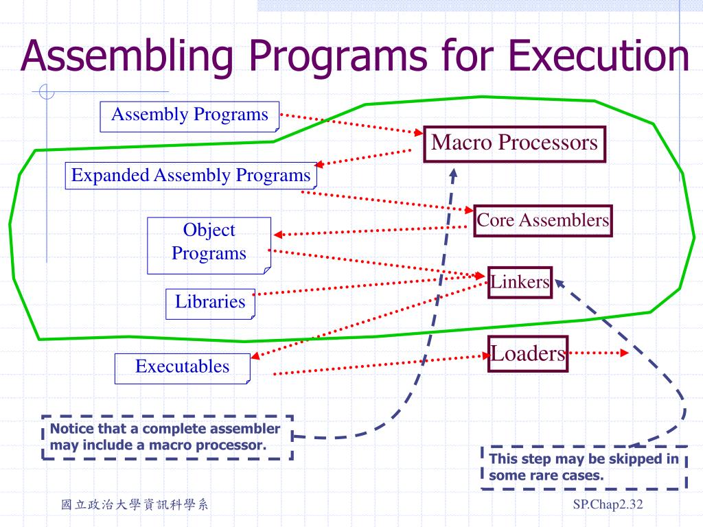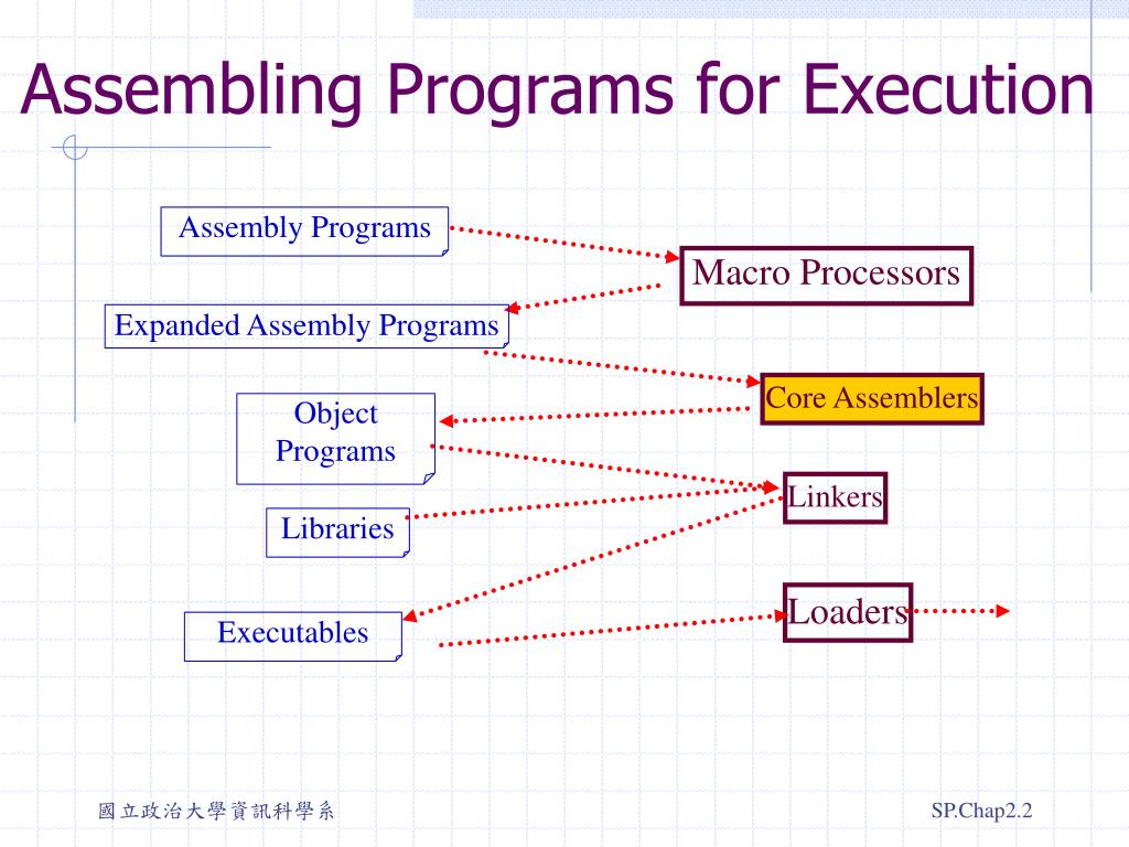 系統程式. Chapter 2 : Assemblers. Expanded Assembly Programs. Object Programs. Linkers. Libraries. Loaders. Assembling Programs for Execution. Assembly Programs. Macro Processors. Core Assemblers. Executables. Assemblers. Input and output of an assembler: