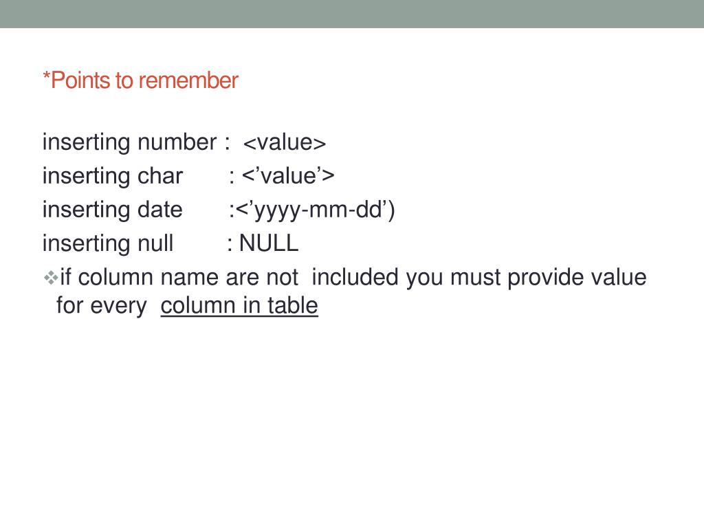 *Points to remember inserting number : <value> inserting char : <’value’> inserting date :<’yyyy-mm-dd’) inserting null : NULL • if column name are not included you must provide value for every column in table