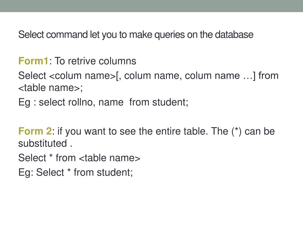 Select command let you to make queries on the database Form1: To retrive columns Select <colum name>[, colum name, colum name …] from <table name>; Eg : select rollno, name from student; Form 2: if you want to see the entire table. The (*) can be substituted . Select * from <table name> Eg: Select * from student;