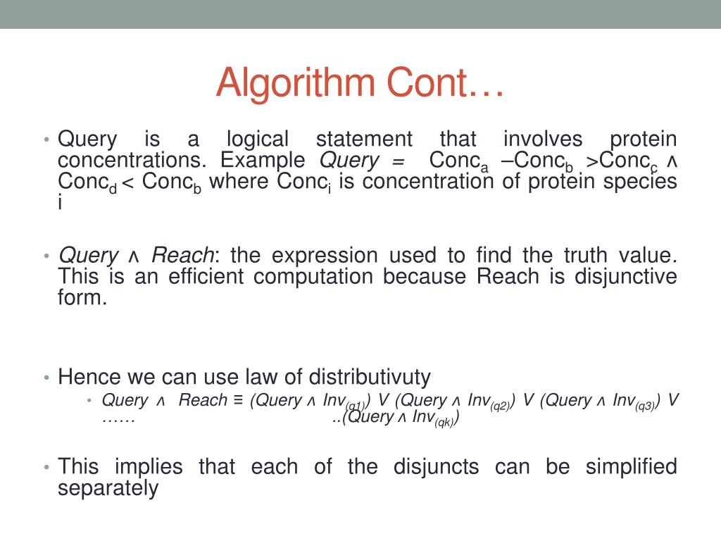 Algorithm Cont… • Query is a logical statement that involves protein concentrations. Example Query = Conca –Concb >Conccᴧ Concd< Concb where Conci is concentration of protein species i • Query ᴧ Reach: the expression used to find the truth value. This is an efficient computation because Reach is disjunctive form. • Hence we can use law of distributivuty • Query ᴧ Reach ≡ (Query ᴧ Inv(q1)) V (Query ᴧ Inv(q2)) V (Query ᴧ Inv(q3)) V …… ..(Query ᴧ Inv(qk)) • This implies that each of the disjuncts can be simplified separately