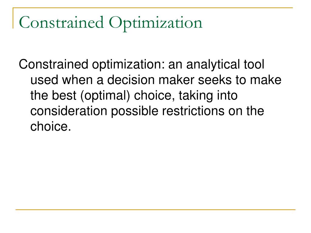 Constrained Optimization Constrained optimization: an analytical tool used when a decision maker seeks to make the best (optimal) choice, taking into consideration possible restrictions on the choice.