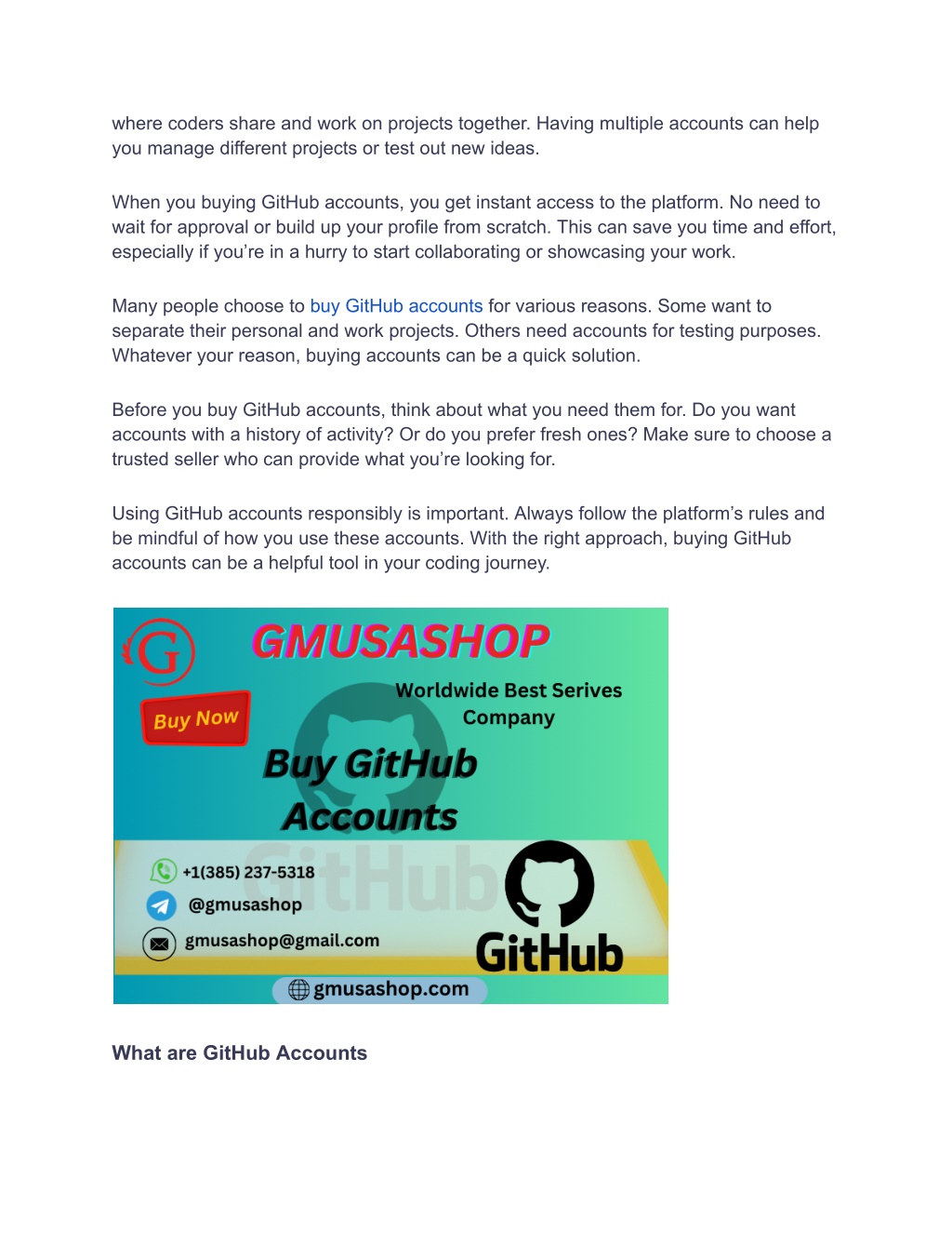 Contact Us / 24 Hours Reply Telegram: @gmusashop WhatsApp: +1 (385)237-5318 Email: gmusashop@gamil.com Buy GitHub Accounts Are you looking to boost your coding projects? Want to join a thriving community of developers? You might want to buy GitHub accounts. GitHub is a popular platform