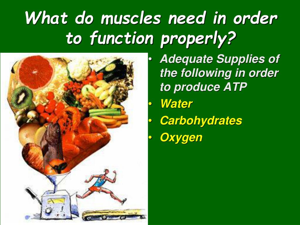 What do muscles need in order to function properly? • Adequate Supplies of the following in order to produce ATP • Water • Carbohydrates • Oxygen