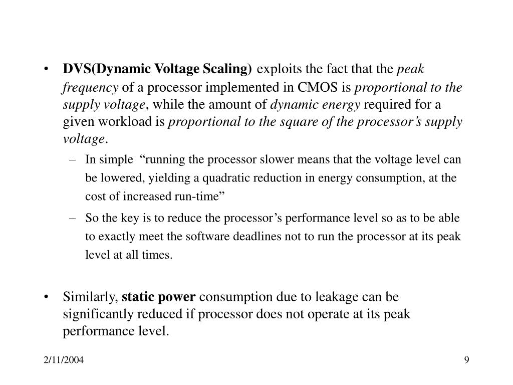 DVS(Dynamic Voltage Scaling)exploits the fact that the peak frequency of a processor implemented in CMOS is proportional to the supply voltage, while the amount of dynamic energy required for a given workload is proportional to the square of the processor’s supply voltage. • In simple “running the processor slower means that the voltage level can be lowered, yielding a quadratic reduction in energy consumption, at the cost of increased run-time” • So the key is to reduce the processor’s performance level so as to be able to exactly meet the software deadlines not to run the processor at its peak level at all times. • Similarly, static power consumption due to leakage can be significantly reduced if processor does not operate at its peak performance level.