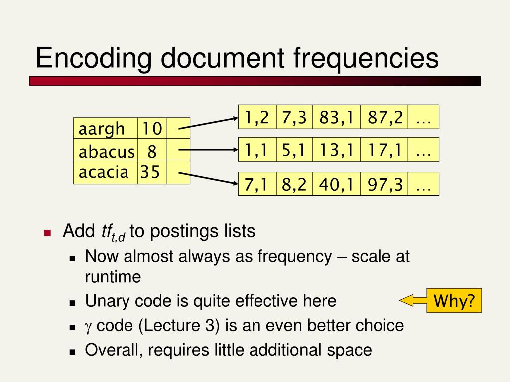1,2 7,3 83,1 87,2 … 1,1 5,1 13,1 17,1 … 7,1 8,2 40,1 97,3 … aargh 10 abacus 8 acacia 35 Encoding document frequencies • Add tft,d to postings lists • Now almost always as frequency – scale at runtime • Unary code is quite effective here • code (Lecture 3) is an even better choice • Overall, requires little additional space Why?