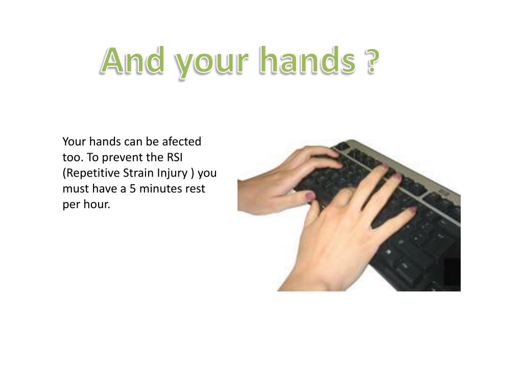 And your hands ? Your hands can be afected too. To prevent the RSI (Repetitive Strain Injury ) you must have a 5 minutes rest per hour.