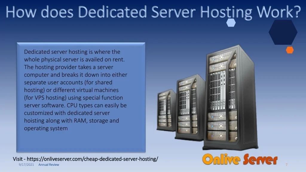 Advantages oF Managed Dedicated Server Better Better Management Management Managed Managed Dedicated Dedicated Server Server Highly Secure Highly Secure Web Hosting Web Hosting Scalability Scalability Better Better Performance Performance Visit Visit - - https://onliveserver.com/cheap https://onliveserver.com/cheap- -dedicated dedicated- -server server- -hosting/ hosting/ 9/17/2021 Annual Review Annual Review 6