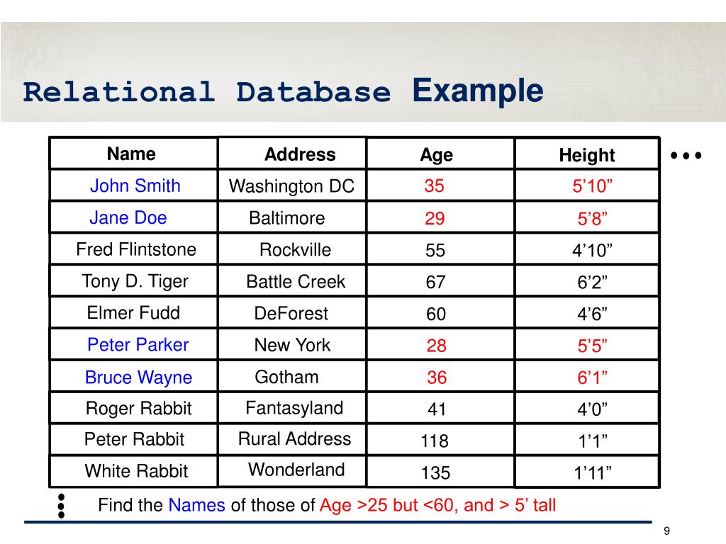 Relational Database Example Name Address Age Height John Smith 35 Washington DC 5’10” Jane Doe Baltimore 29 5’8” Fred Flintstone Rockville 55 4’10” Tony D. Tiger Battle Creek 67 6’2” Elmer Fudd DeForest 60 4’6” Peter Parker New York 28 5’5” Gotham Bruce Wayne 36 6’1” Fantasyland Roger Rabbit 41 4’0” Rural Address Peter Rabbit 118 1’1” Wonderland White Rabbit 135 1’11” Find the Namesof those of Age >25 but <60, and > 5’ tall