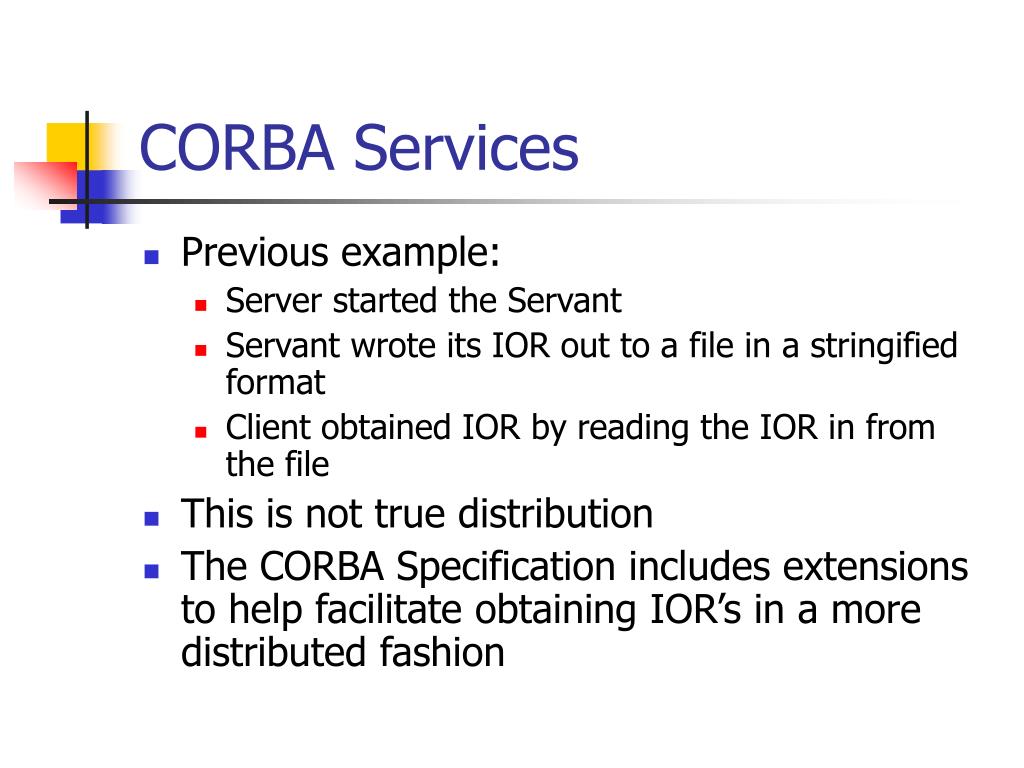 CORBA Services • Previous example: • Server started the Servant • Servant wrote its IOR out to a file in a stringified format • Client obtained IOR by reading the IOR in from the file • This is not true distribution • The CORBA Specification includes extensions to help facilitate obtaining IOR’s in a more distributed fashion