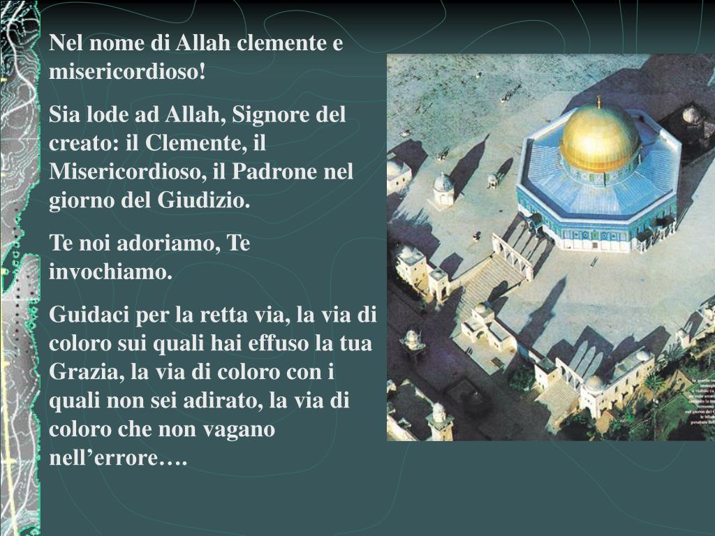 Nel nome di Allah clemente e misericordioso! Sia lode ad Allah, Signore del creato: il Clemente, il Misericordioso, il Padrone nel giorno del Giudizio. Te noi adoriamo, Te invochiamo. Guidaci per la retta via, la via di coloro sui quali hai effuso la tua Grazia, la via di coloro con i quali non sei adirato, la via di coloro che non vagano nell’errore….