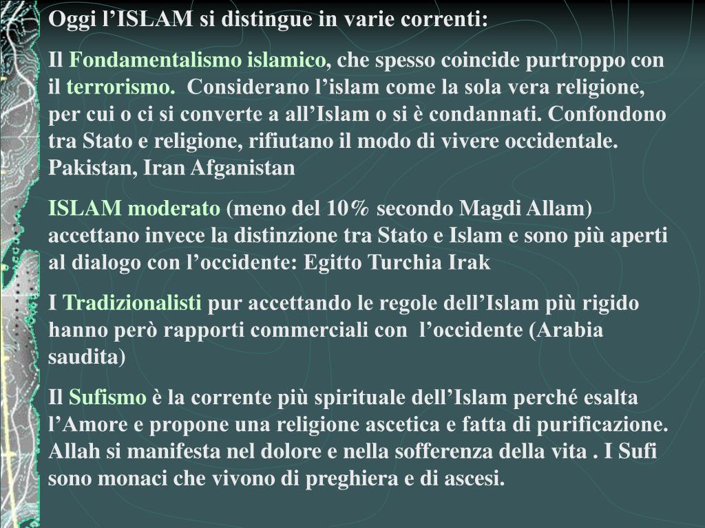 Oggi l’ISLAM si distingue in varie correnti: Il Fondamentalismo islamico, che spesso coincide purtroppo con il terrorismo. Considerano l’islam come la sola vera religione, per cui o ci si converte a all’Islam o si è condannati. Confondono tra Stato e religione, rifiutano il modo di vivere occidentale. Pakistan, Iran Afganistan ISLAM moderato (meno del 10% secondo Magdi Allam) accettano invece la distinzione tra Stato e Islam e sono più aperti al dialogo con l’occidente: Egitto Turchia Irak I Tradizionalisti pur accettando le regole dell’Islam più rigido hanno però rapporti commerciali con l’occidente (Arabia saudita) Il Sufismo è la corrente più spirituale dell’Islam perché esalta l’Amore e propone una religione ascetica e fatta di purificazione. Allah si manifesta nel dolore e nella sofferenza della vita . I Sufi sono monaci che vivono di preghiera e di ascesi.