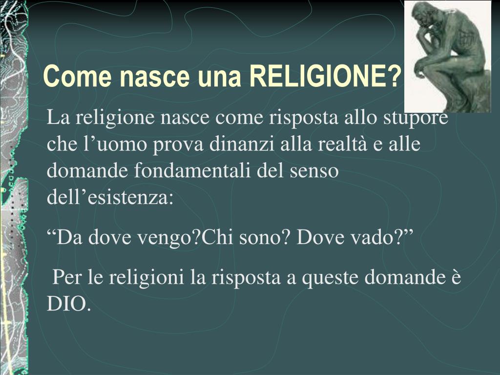 Come nasce una RELIGIONE? La religione nasce come risposta allo stupore che l’uomo prova dinanzi alla realtà e alle domande fondamentali del senso dell’esistenza: “Da dove vengo?Chi sono? Dove vado?” Per le religioni la risposta a queste domande è DIO.