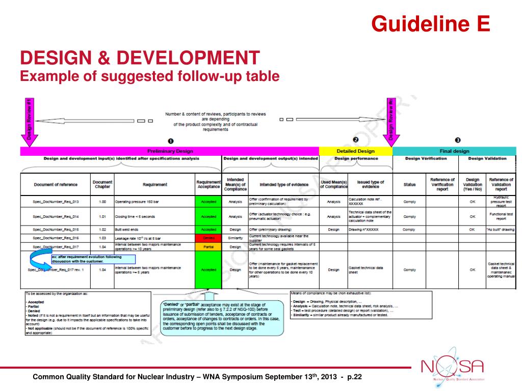 DESIGN & DEVELOPMENTExample of suggested follow-up table Guideline E Common Quality Standard for Nuclear Industry – WNA Symposium September 13th, 2013 - p.22