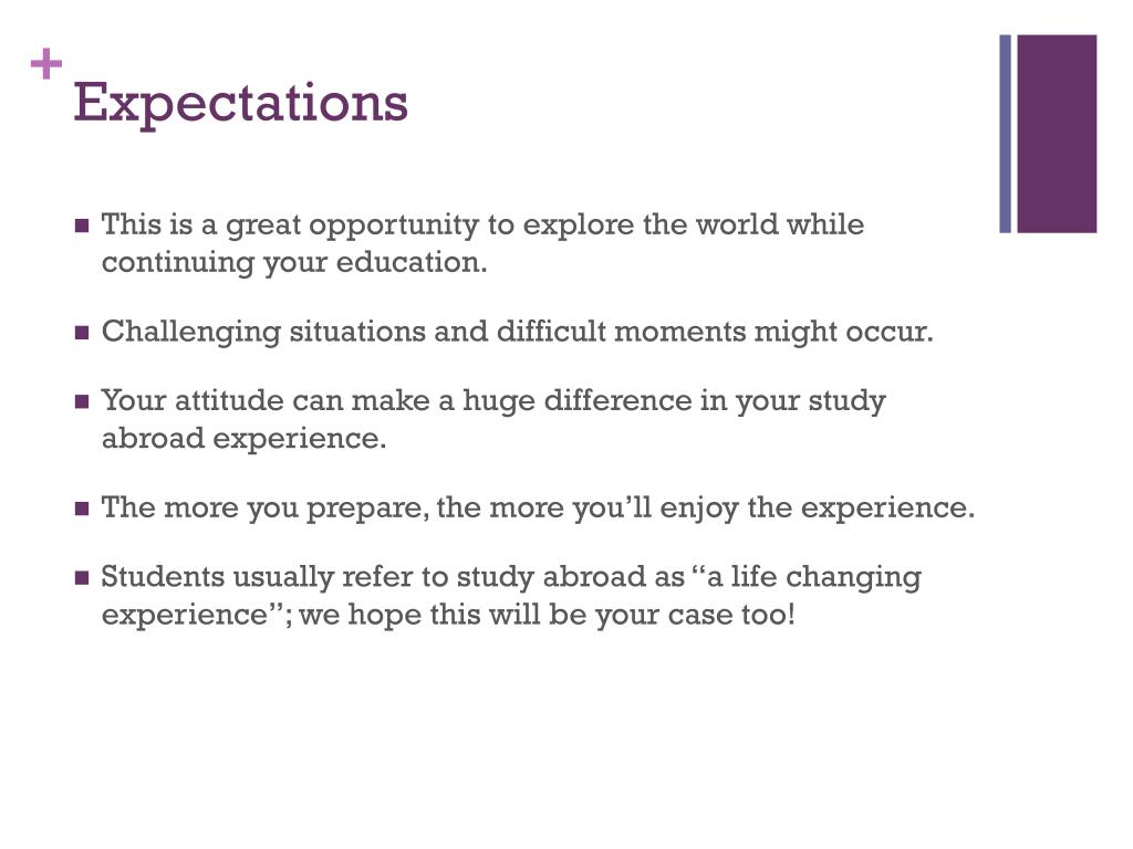 Expectations • This is a great opportunity to explore the world while continuing your education. • Challenging situations and difficult moments might occur. • Your attitude can make a huge difference in your study abroad experience. • The more you prepare, the more you’ll enjoy the experience. • Students usually refer to study abroad as “a life changing experience”; we hope this will be your case too!