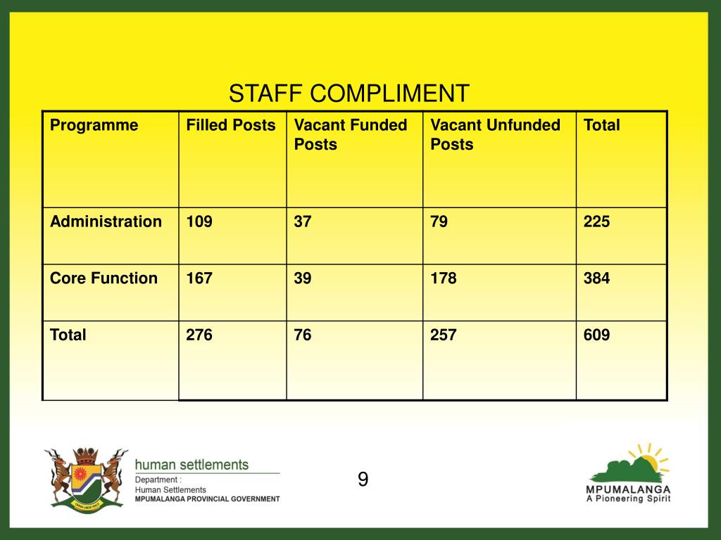 BUDGET ALLOCATION • Conditional grant has increased by 26% from R629,210 million to R795,447 million; • Conditional grant accounts for 82% of total allocation; • Equitable share is R173,280 million (18%) • Compensation of employees (COE) is R98,017 million (10%) of total allocation; • R41,362million (42%) of COE for Administration; • R56,655 million (58%) of COE for Core Function; 8