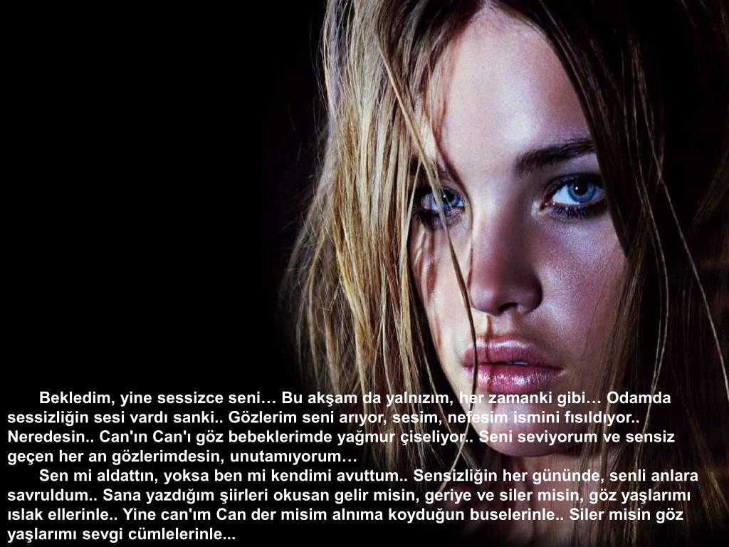 Bekledim, yine sessizce seni… Bu akşam da yalnızım, her zamanki gibi… Odamda sessizliğin sesi vardı sanki.. Gözlerim seni arıyor, sesim, nefesim ismini fısıldıyor.. Neredesin.. Can'ın Can'ı göz bebeklerimde yağmur çiseliyor.. Seni seviyorum ve sensiz geçen her an gözlerimdesin, unutamıyorum… Sen mi aldattın, yoksa ben mi kendimi avuttum.. Sensizliğin her gününde, senli anlara savruldum.. Sana yazdığım şiirleri okusan gelir misin, geriye ve siler misin, göz yaşlarımı ıslak ellerinle.. Yine can'ım Can der misim alnıma koyduğun buselerinle.. Siler misin göz yaşlarımı sevgi cümlelerinle...