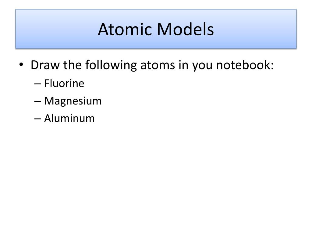 Atomic Models • Draw the following atoms in you notebook: • Fluorine • Magnesium • Aluminum