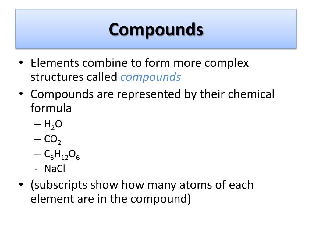 Compounds • Elements combine to form more complex structures called compounds • Compounds are represented by their chemical formula • H2O • CO2 • C6H12O6 • NaCl • (subscripts show how many atoms of each element are in the compound)