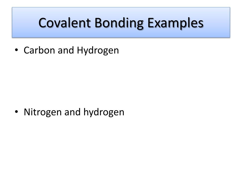 Covalent Bonding Examples • Carbon and Hydrogen • Nitrogen and hydrogen