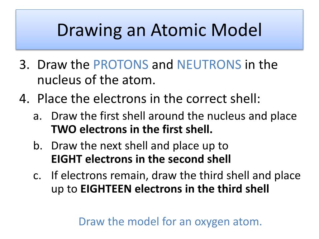 Drawing an Atomic Model • Draw the PROTONS and NEUTRONS in the nucleus of the atom. • Place the electrons in the correct shell: • Draw the first shell around the nucleus and place TWO electrons in the first shell. • Draw the next shell and place up to EIGHT electrons in the second shell • If electrons remain, draw the third shell and place up to EIGHTEEN electrons in the third shell Draw the model for an oxygen atom.