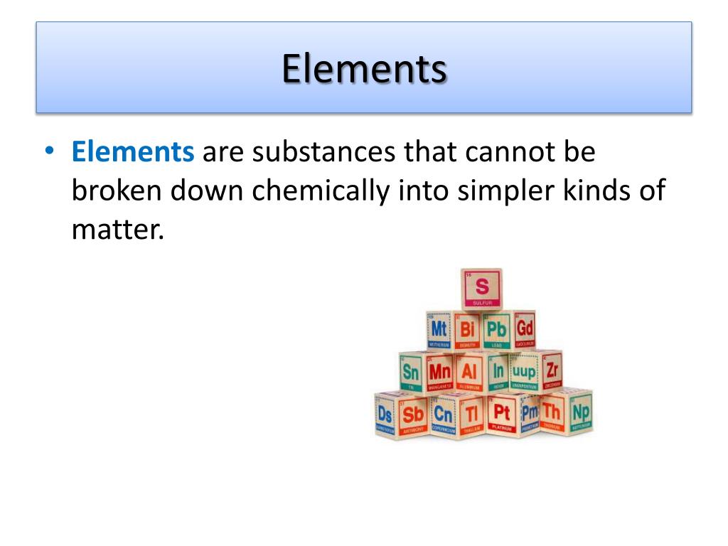 Elements • Elements are substances that cannot be broken down chemically into simpler kinds of matter.