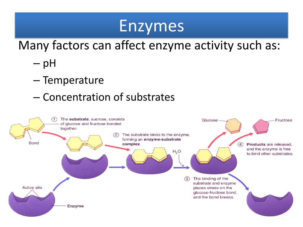 Enzymes Many factors can affect enzyme activity such as: • pH • Temperature • Concentration of substrates