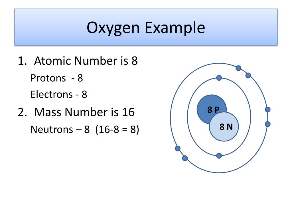 Oxygen Example • Atomic Number is 8 Protons - 8 Electrons - 8 • Mass Number is 16 Neutrons – 8 (16-8 = 8) 8 P 8 N