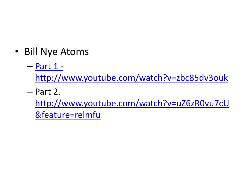 Bill Nye Atoms • Part 1 - http://www.youtube.com/watch?v=zbc85dv3ouk • Part 2. http://www.youtube.com/watch?v=uZ6zR0vu7cU&feature=relmfu