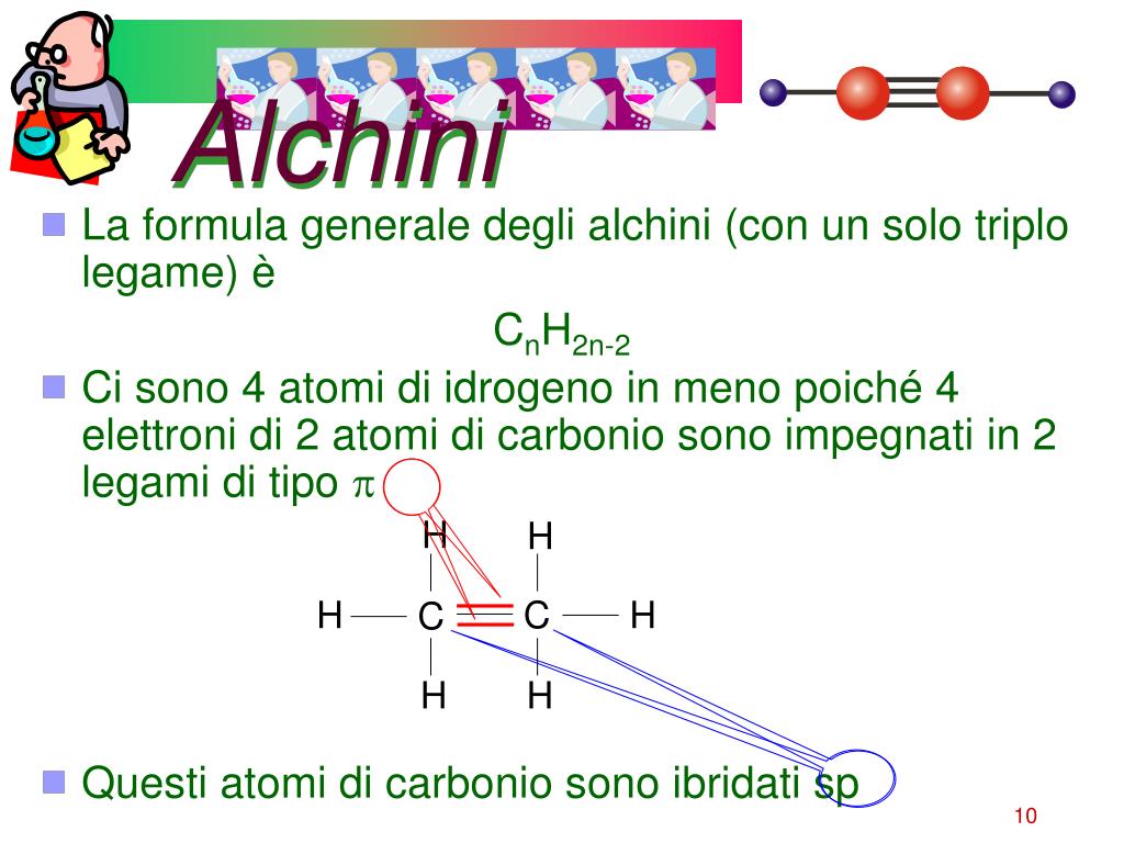 H C H C H H H H Alchini • La formula generale degli alchini (con un solo triplo legame) è CnH2n-2 • Ci sono 4 atomi di idrogeno in meno poiché 4 elettroni di 2 atomi di carbonio sono impegnati in 2 legami di tipo • Questi atomi di carbonio sono ibridati sp