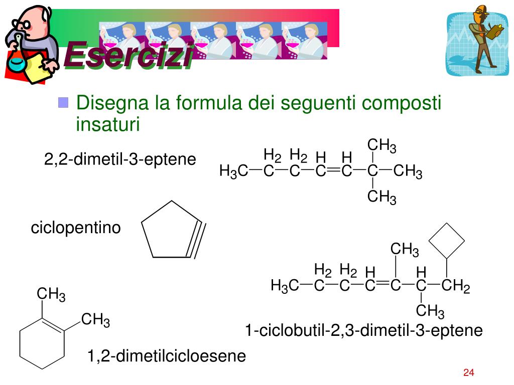 Esercizi • Disegna la formula dei seguenti composti insaturi 2,2-dimetil-3-eptene ciclopentino 1-ciclobutil-2,3-dimetil-3-eptene 1,2-dimetilcicloesene