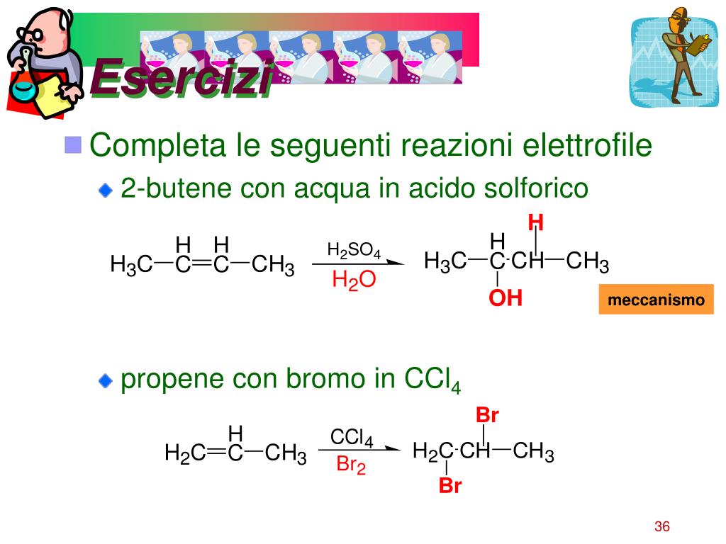 Esercizi • Completa le seguenti reazioni elettrofile • 2-butene con acqua in acido solforico meccanismo • propene con bromo in CCl4